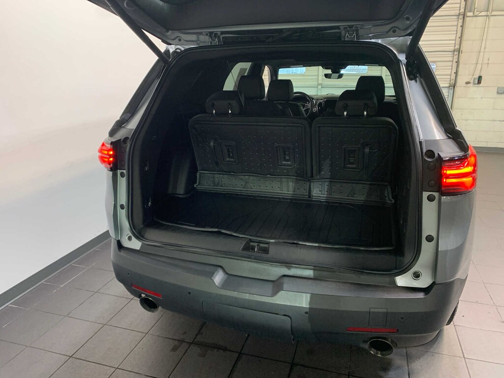 with tilt-sliding front and fixed rear, includes power rear sunscreen, includes (V08) heavy-duty cooling system, trailer hitch and (CTT) trailering assist guidelines (Includes (PZ8) Hitch Guidance with Hitch View.), includes (RIA) front and second row all-weather floor liner, LPO, (RIB) third row all-weather floor liner, LPO and (CAV) integrated cargo liner, LPO, with connected Navigation, 8 diagonal HD color touchscreen, AM/FM stereo, Bluetooth® audio streaming for 2 active devices, Apple CarPlay® and Android Auto® capable, enhanced voice recognition, in-vehicle apps, cloud connected personalization for select infotainment and vehicle settings. Subscription required for enhanced and connected services after trial period (STD), (310 hp [232.0 kW] @ 6800 rpm, 266 lb-ft of torque [361 N-m] @ 2800 rpm) (STD), (STD). Chevrolet RS with Sterling Gray Metallic exterior and Jet Black/Spice Red interior features a V6 Cylinder Engine with 310 HP at 6800 RPM*.