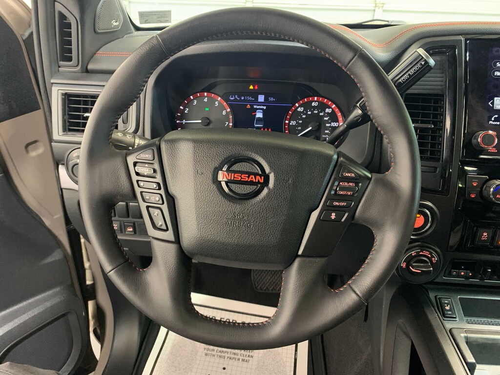4-Way Power Assist Seat, Memory Driver Seat w/Auto Entry/Exit Feature, Heated Driver & Passenger Seat, Heated Rear Seats, Remote Engine Start on Key Fob, Side Turn Signal Lamps on Mirror Housing, Heated Power Tilt/Telescopic Steering Wheel, memory, Power Folding Auto Dimming Outside Mirrors, memory and reverse auto tilt, Puddle Lamps, Intelligent Around View Monitor (I-AVM), Moving Object Detection (MOD), LED Tailgate Area Illumination, Trailer Brake Controller, LED Under Rail Bed Lighting, Fender Premium Audio System w/12 Speakers, amplifier, underseat subwoofer, center channel speaker and front and rear tweeters, Front & Rear Parking Sensors, Proximity Activation, LED signature headlamps and cargo lamp, 110V Outlet in Bed, Utilitrack System w/4 Tie-Down Cleats, Trailer Light Check Function On Key Fob, Power Sliding Rear Window w/Defogger, Rear Utility Bed Step, Electronic Locking Tailgate, PRO4X RUGGED STEP BOARDS, crew cab interior door scuff protection, off-road adventure kit and adventure medic kit, All Season Floor Mats. Nissan PRO-4X with Baja Storm exterior and Black interior features a 8 Cylinder Engine with 400 HP at 5800 RPM*. Local Trade-In