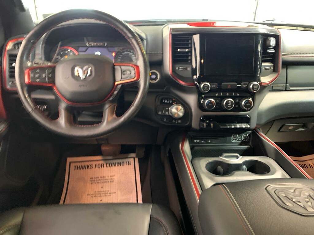 Google Android Auto®, Radio: Uconnect 4 w/8.4 Display, Rear Window Defroster, Rain Sensitive Windshield Wipers, Integrated Center Stack Radio, ParkSense Front/Rear Park Assist w/Stop, Rear View Auto Dim Mirror, Power Adjustable Pedals, Rear Dome w/On/Off Switch Lamp, 115V Auxiliary Rear Power Outlet, Auto Dim Exterior Driver Mirror, 2 USB Full Function/Charge Only Media Hub, Rear Underseat Compartment Storage, Heated Front Seats, Heated Steering Wheel, 8.4 Touchscreen Display, Foam Bottle Insert (Door Trim Panel), Security Alarm, Power Heated Fold Away Mirrors, Apple CarPlay®, Remote Start System, Exterior Mirrors w/Supplemental Signals, Exterior Mirrors Courtesy Lamps, Air Conditioning ATC w/Dual Zone Control, Remote Proximity Keyless Entry, Universal Garage Door Opener, Power-Folding, Active Noise Control System, Heavy Duty Engine Cooling, Dual Exhaust w/Black Tips, GVWR: 7,100 lbs, Hemi Badge, 23 Gallon Fuel Tank, 18 Aluminum Spare Wheel, Google Android Auto®, SiriusXM Traffic Plus, Disassociated Touchscreen Display, HD Radio, For Details, Visit DriveUconnect.com, Integrated Center Stack Radio, 1-Yr SiriusXM Guardian Trial, Air Conditioning ATC w/Dual Zone Control, GPS Navigation, SiriusXM Travel Link, No Satellite Coverage w/HI/AK/PR/VI/GU, 8.4 Touchscreen Display, Apple CarPlay®, BLIND SPOT & CROSS PATH DETECTION, SPRAY IN BEDLINER, TRANSMISSION: 8-SPEED AUTOMATIC (8HP75). Ram Rebel with Flame Red Clearcoat exterior and Red/Black interior features a 8 Cylinder Engine with 305 HP at 6400 RPM*. Serviced here, Originally bought here, Local Trade-In