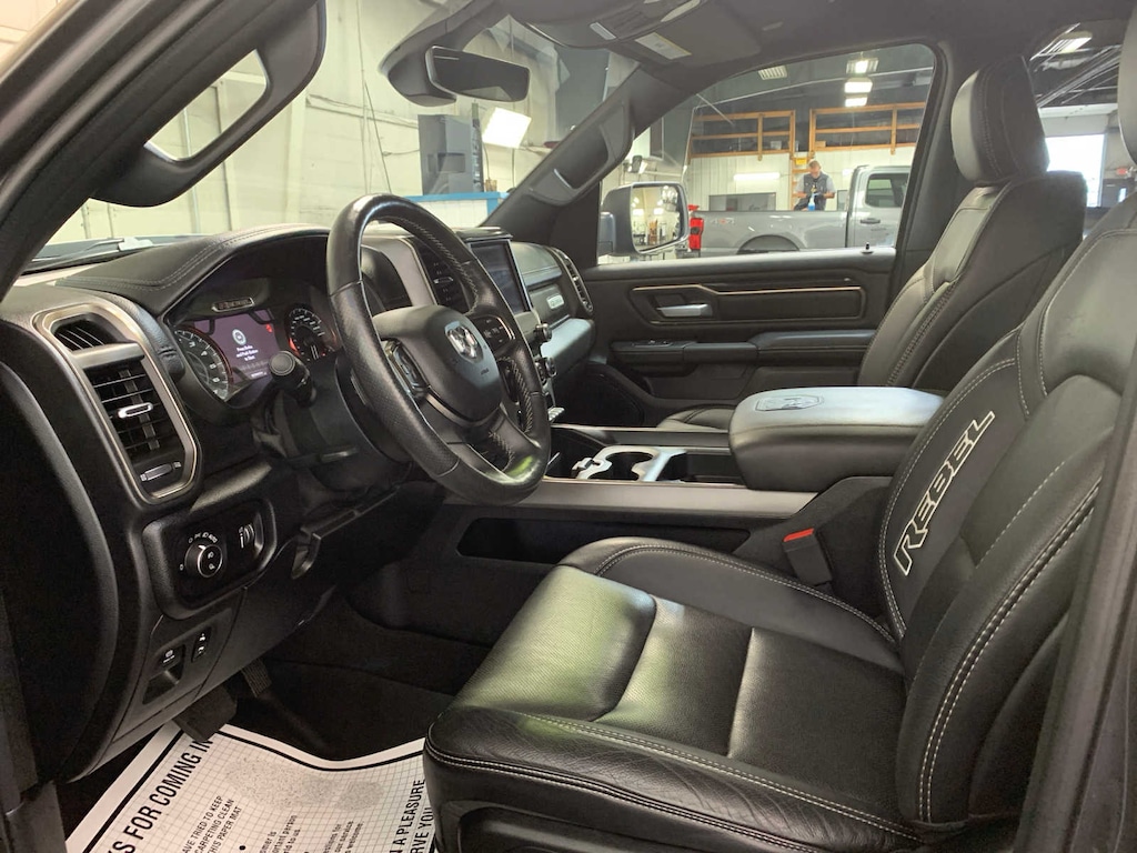 Radio: Uconnect 4 w/8.4 Display, Remote Start System, Rear Window Defroster, Rain Sensitive Windshield Wipers, ParkSense Front/Rear Park Assist w/Stop, Rear View Auto Dim Mirror, Power Adjustable Pedals, Rear Dome w/On/Off Switch Lamp, 115V Auxiliary Rear Power Outlet, 2 USB Full Function/Charge Only Media Hub, Rear Underseat Compartment Storage, Remote Proximity Keyless Entry, Universal Garage Door Opener, Heated Front Seats, Heated Steering Wheel, Foam Bottle Insert (Door Trim Panel), Single Disc Remote CD Player, Security Alarm, Black Premium Power Mirrors, Sun Visors w/Illuminated Vanity Mirrors, Active Noise Control System, Heavy Duty Engine Cooling, Dual Exhaust w/Black Tips, GVWR: 7,100 lbs, Hemi Badge, 23 Gallon Fuel Tank, 18 Aluminum Spare Wheel, Heated Front Seats, Heated Steering Wheel, Power 4-Way Passenger Lumbar Adjust, Power 8-Way Driver & Passenger Seats, BLIND SPOT & CROSS PATH DETECTION, REMOTE START SYSTEM, TRANSMISSION: 8-SPEED AUTOMATIC (8HP75). Ram Rebel with Granite Crystal Metallic Clearcoat exterior and Black interior features a 8 Cylinder Engine with 305 HP at 6400 RPM*.