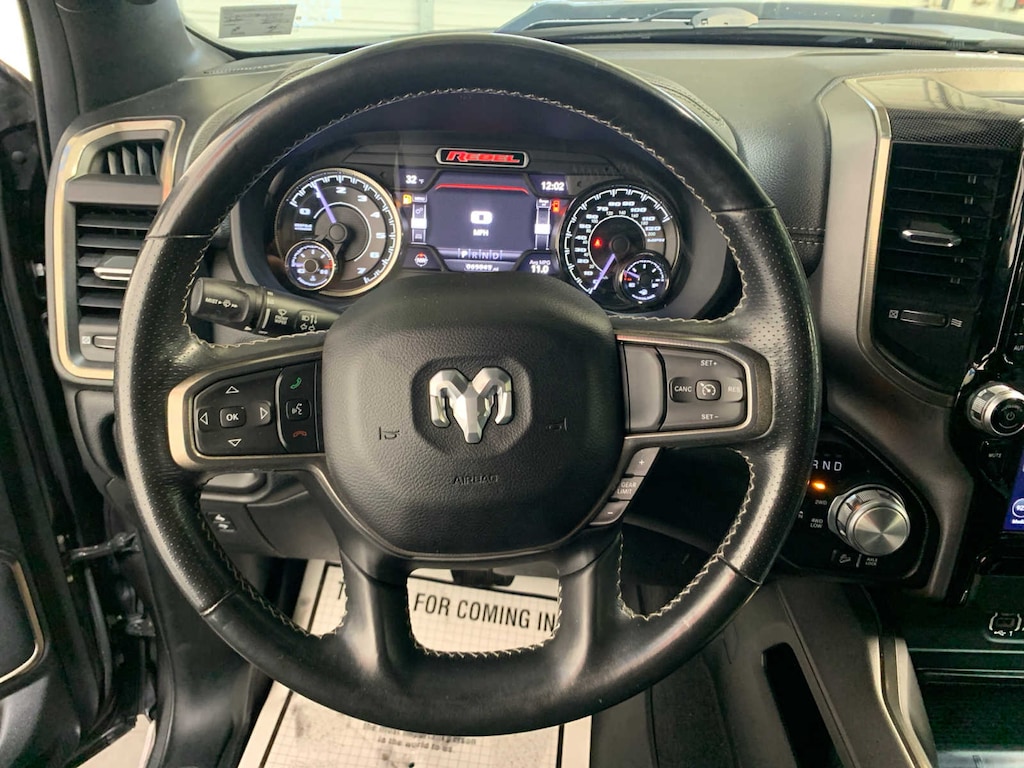 Radio: Uconnect 4 w/8.4 Display, Rear Window Defroster, Rain Sensitive Windshield Wipers, ParkSense Front/Rear Park Assist w/Stop, Power Adjustable Pedals, Rear Dome w/On/Off Switch Lamp, Body Color Door Handles, 115V Auxiliary Rear Power Outlet, Media Hub w/2 Charge Only USBs, Auto Dim Exterior Driver Mirror, Rear Underseat Compartment Storage, Heated Front Seats, Heated Steering Wheel, Foam Bottle Insert (Door Trim Panel), Security Alarm, Black Premium Power Mirrors, Remote Start System, Exterior Mirrors w/Supplemental Signals, Exterior Mirrors Courtesy Lamps, Air Conditioning ATC w/Dual Zone Control, Remote Proximity Keyless Entry, Universal Garage Door Opener, Power-Folding Mirrors, Sun Visors w/Illuminated Vanity Mirrors, harman/kardon® 19 Speaker Premium Sound, Radio: Uconnect 12 w/Navigation, Google Android Auto®, SiriusXM Traffic Plus, USB Host Flip, Disassociated Touchscreen Display, HD Radio, For Details, Visit DriveUconnect.com, Integrated Center Stack Radio, 1-Yr SiriusXM Guardian Trial, 12 Touchscreen Display, GPS Navigation, SiriusXM Travel Link, 4G LTE Wi-Fi Hot Spot, SiriusXM w/360L, Apple CarPlay®, LED Footwell Lighting, Active Noise Control System, Heavy Duty Engine Cooling, Dual Exhaust w/Black Tips, GVWR: 7,100 lbs, HEMI Badge, 220 Amp Alternator, Premium Overhead Console, Dome Dual LED Reading Lamp, Overhead LED Lamps, REMOTE START SYSTEM, TRANSMISSION: 8-SPEED AUTOMATIC (8HP75), Heated Front Seats, Heated Steering Wheel, Power 4-Way Passenger Lumbar Adjust, Power 8-Way Driver & Passenger Seats. Ram Rebel with Granite Crystal Metallic Clearcoat exterior and Black interior features a 8 Cylinder Engine with 305 HP at 6400 RPM*. Great Shape