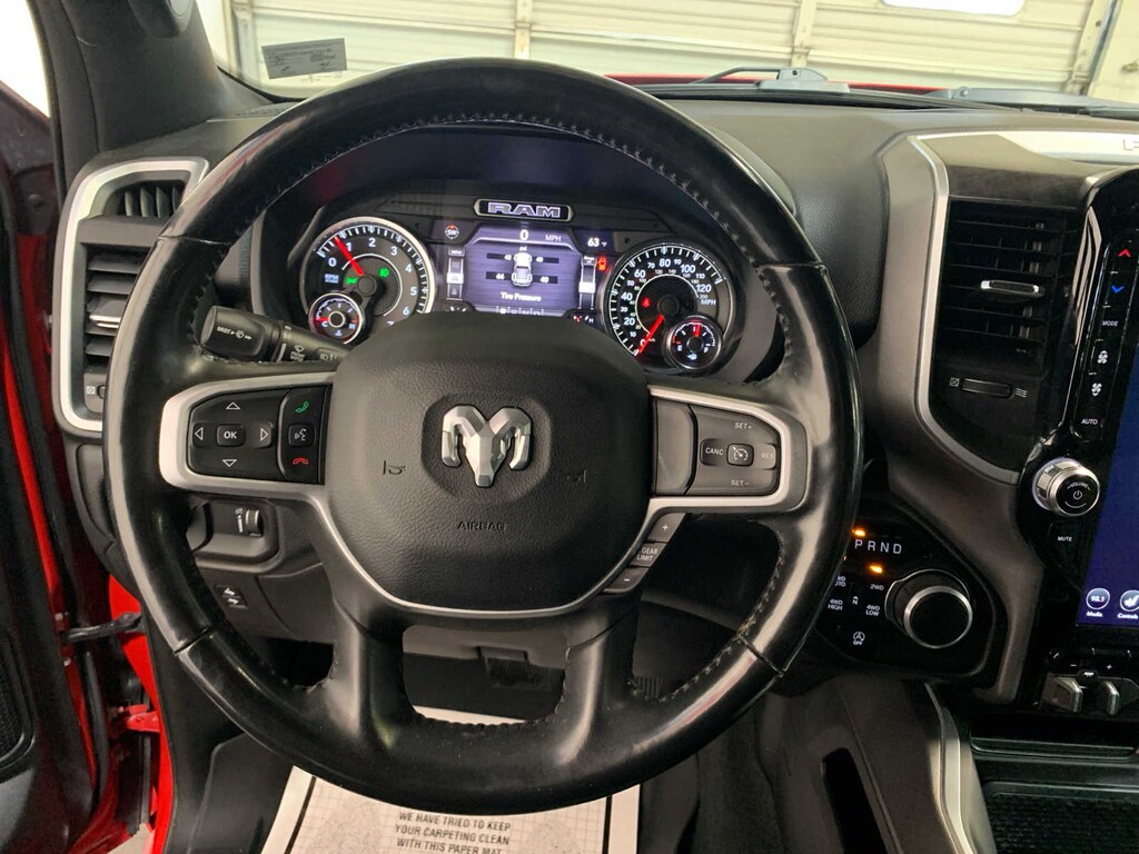 SiriusXM Radio Service, Rear Window Defroster, ParkSense Front/Rear Park Assist w/Stop, Rear View Auto Dim Mirror, Power Adjustable Pedals, For More Info, Call 800-643-2112, Rear Power Sliding Window, Rear Dome w/On/Off Switch Lamp, Glove Box Lamp, Power 4-Way Driver Lumbar Adjust, 115V Auxiliary Rear Power Outlet, Media Hub w/2 Charge Only USBs, Power 8-Way Driver Seat, Auto Dim Exterior Driver Mirror, Heated Front Seats, Heated Steering Wheel, Foam Bottle Insert (Door Trim Panel), Class IV Receiver Hitch, Security Alarm, Black Premium Power Mirrors, Big Horn IP Badge, Remote Start System, SiriusXM Satellite Radio, Exterior Mirrors w/Supplemental Signals, Exterior Mirrors Courtesy Lamps, Air Conditioning ATC w/Dual Zone Control, 115V Auxiliary Power Outlet, 400W Inverter, Cluster 7.0 TFT, Active Noise Control System, Heavy Duty Engine Cooling, GVWR: 7,100 lbs, Dual Rear Exhaust w/Bright Tips, HEMI Badge, 23 Gallon Fuel Tank, 18 Aluminum Spare Wheel, Tires: 275/55R20 OWL All Season, Accent Color Premium Power Mirrors, Exterior Mirrors w/Supplemental Signals, Black Headlamp Bezels, Exterior Mirrors Courtesy Lamps, Auto Dim Exterior Driver Mirror, Black Exterior Truck Badging, Anti-Spin Differential Rear Axle, Wheels: 20 x 9.0 Premium Paint/Polished, Exterior Mirrors w/Memory, Black Interior Accents, Dual Exhaust w/Black Tips, Power-Folding Mirrors, Body Color Front Bumper, Body Color Rear Bumper w/Step Pads, Black Painted Exterior Mirrors Caps, Google Android Auto®, SiriusXM Radio Service, SiriusXM Traffic Plus, SiriusXM Satellite Radio, USB Host Flip, Disassociated Touchscreen Display, HD Radio, For Details, Visit DriveUconnect.com, Integrated Center Stack Radio, For More Info, Call 800-643-2112, 1-Yr SiriusXM Guardian Trial, 12 Touchscreen Display, GPS Navigation, SiriusXM Travel Link, 4G LTE Wi-Fi Hot Spot, SiriusXM w/360L, Apple CarPlay®, LED Footwell Lighting, 9 AMPLIFIED SPEAKERS W/SUBWOOFER, TRANSMISSION: 8-SPEED AUTOMATIC (8HP75), Power 8-Way Driver Seat, Center Console Parts Module, Bucket Seats, Manual Adjust 4-Way Front Passenger Seat, Full Length Floor Console, Power 4-Way Driver Lumbar Adjust. Ram Big Horn with Flame Red Clearcoat exterior and Black interior features a 8 Cylinder Engine with 305 HP at 6400 RPM*. Nice