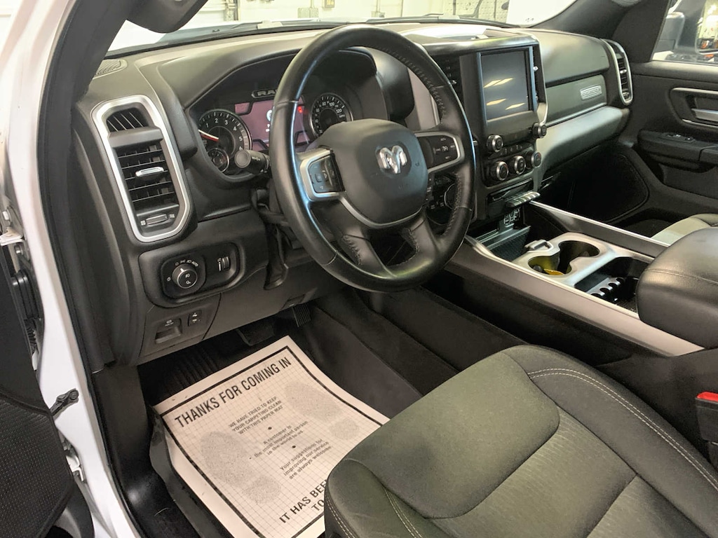 Active Noise Control System, Heavy Duty Engine Cooling, Passive Tuned Mass Damper, GVWR: 7,100 lbs, Dual Rear Exhaust w/Bright Tips, HEMI Badge, 26 Gallon Fuel Tank, Tires: 275/55R20 OWL All Season, Accent Color Premium Power Mirrors, Black Headlamp Bezels, Black Exterior Truck Badging, Anti-Spin Differential Rear Axle, Wheels: 20 x 9.0 Premium Paint/Polished, Grille Surround 1 Black Texture 2 Black, Black Interior Accents, Dual Exhaust w/Black Tips, Body Color Front Bumper, Body Color Rear Bumper w/Step Pads, Black Painted Exterior Mirrors Caps, Google Android Auto®, SiriusXM Radio Service, Bluetooth® Handsfree Phone & Audio, USB Host Flip, Rear Window Defroster, Integrated Center Stack Radio, ParkSense Front/Rear Park Assist w/Stop, Rear View Auto Dim Mirror, Power Adjustable Pedals, For More Info, Call 800-643-2112, Rear Power Sliding Window, Rear Dome w/On/Off Switch Lamp, Connectivity - US/Canada, Glove Box Lamp, 4G LTE Wi-Fi Hot Spot, 115V Auxiliary Rear Power Outlet, Media Hub w/2 Charge Only USBs, Power 8-Way Driver Seat, Auto Dim Exterior Driver Mirror, Heated Front Seats, Radio: Uconnect 5 W w/8.4 Display, Heated Steering Wheel, 8.4 Touchscreen Display, Foam Bottle Insert (Door Trim Panel), Class IV Receiver Hitch, Security Alarm, Apple CarPlay®, Big Horn IP Badge, Black Premium Power Mirrors (GUL), Remote Start System, TRANSMISSION: 8-SPEED AUTOMATIC (8HP75). Ram Big Horn with Bright White Clearcoat exterior and Black interior features a 8 Cylinder Engine with 305 HP at 6400 RPM*. Originally bought here, New Tires, Local Trade-In