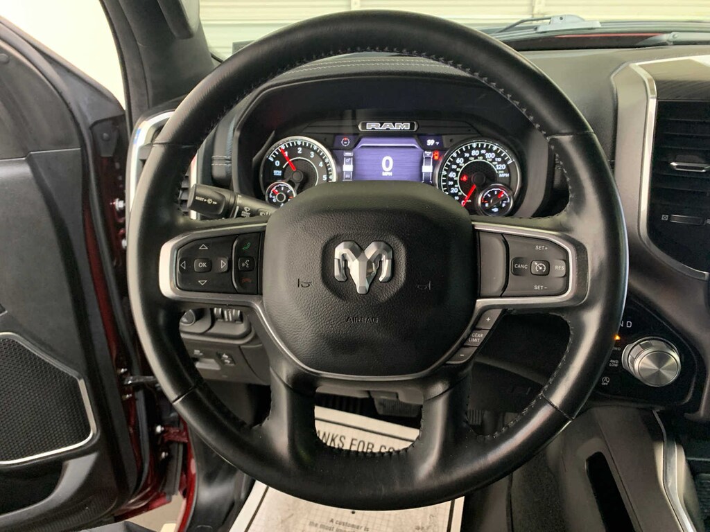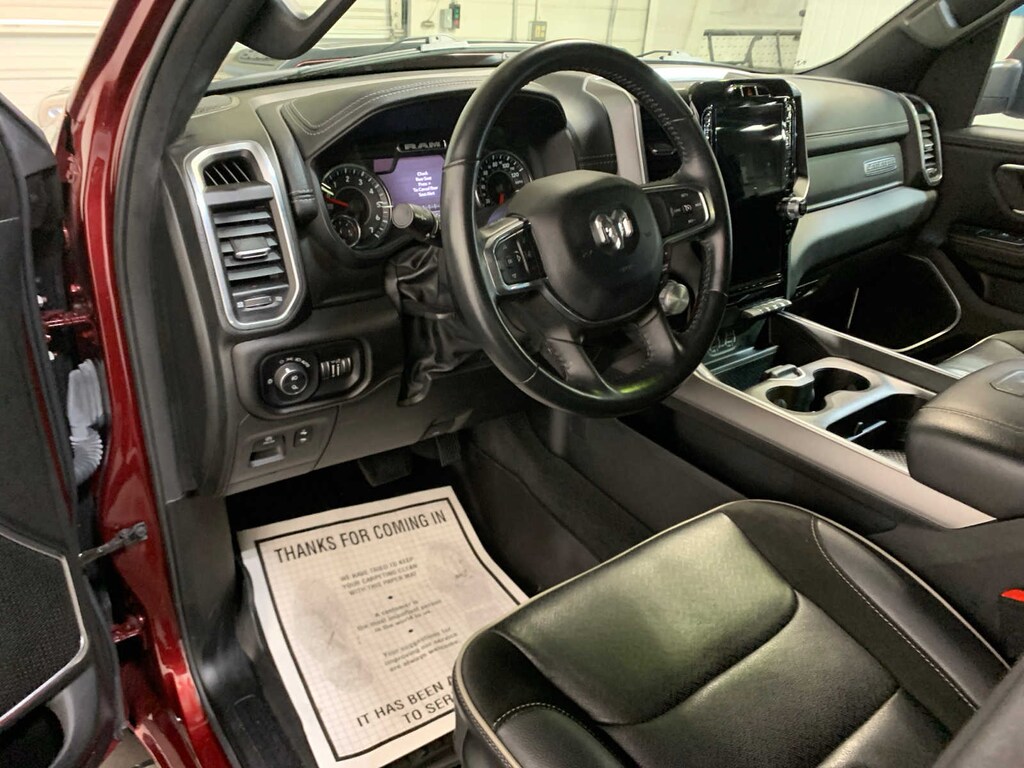 Active Noise Control System, Heavy Duty Engine Cooling, Passive Tuned Mass Damper, GVWR: 7,100 lbs, Dual Rear Exhaust w/Bright Tips, HEMI Badge, 23 Gallon Fuel Tank, 18 Aluminum Spare Wheel, Rear Window Defroster, Blind Spot & Cross Path Detection, Rain Sensitive Windshield Wipers, ParkSense Front/Rear Park Assist w/Stop, Rear Power Sliding Window, 12 Touchscreen Display, Front LED Fog Lamps, LED Reflector Headlamps, Foam Bottle Insert (Door Trim Panel), Radio: Uconnect 5 Nav w/12.0 Display, Remote Tailgate Release, Auto High Beam Headlamp Control, Electric Shift On Demand Transfer Case, Front Door Accent Lighting, 2nd Row In Floor Storage Bins, Rear Door Accent Lighting, Tires: 275/55R20 OWL All Season, Body Color Premium Power Mirrors, Sport Performance Hood, Sport Decal, Wheels: 20 x 9 Premium Painted w/Inserts, Body Color Exterior Mirrors, Black Interior Accents, Body Color Front Bumper, Body Color Rear Bumper w/Step Pads, Grille Surround 3 Body Color Tex 2 Black, Bucket Seats, Center Console Parts Module, Full Length Upgraded Floor Console, ANTI-SPIN DIFFERENTIAL REAR AXLE, CLASS IV RECEIVER HITCH, TRANSMISSION: 8-SPEED AUTOMATIC (8HP75). Ram Laramie with Delmonico Red Pearlcoat exterior and Black interior features a 8 Cylinder Engine with 395 HP at 5600 RPM*. Local Trade-In