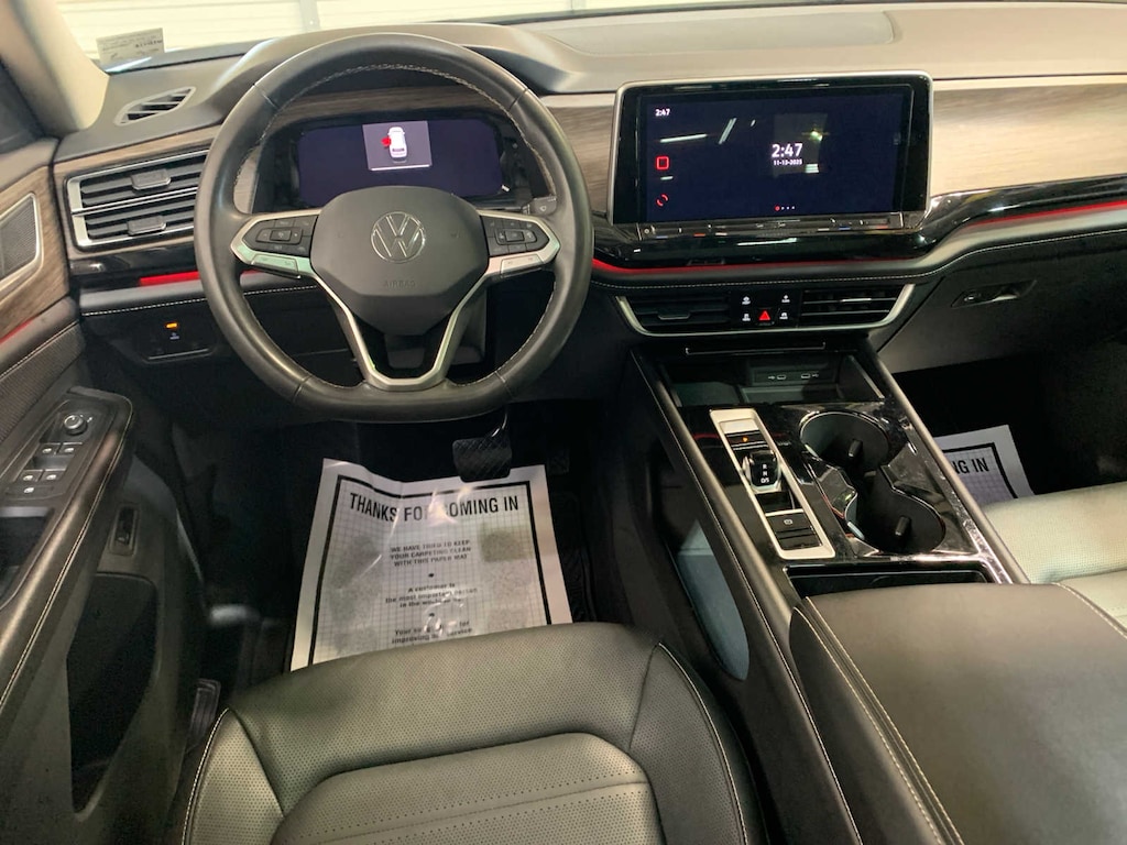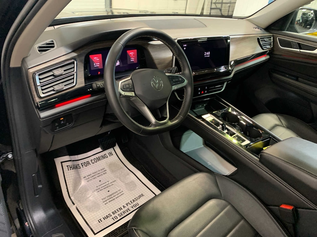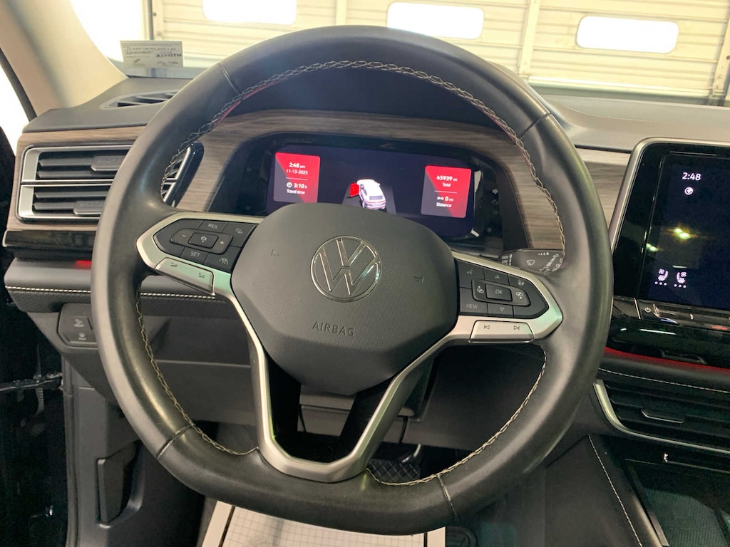 KEY FEATURES INCLUDE Leather Seating, Third Row Seat, Navigation, Sunroof, Panoramic Roof, Power Liftgate, Heated Driver Seat, Heated Rear Seat, Cooled Driver Seat, Back-Up Camera, iPod/MP3 Input, Onboard Communications System, Trailer Hitch, Aluminum Wheels, Dual Zone A/C Rear Spoiler, MP3 Player, Rear Air, Satellite Radio, Privacy Glass. Volkswagen 2.0T SEL with Deep Black Pearl exterior and Titan Black interior features a 4 Cylinder Engine with 269 HP at 5500 RPM*.